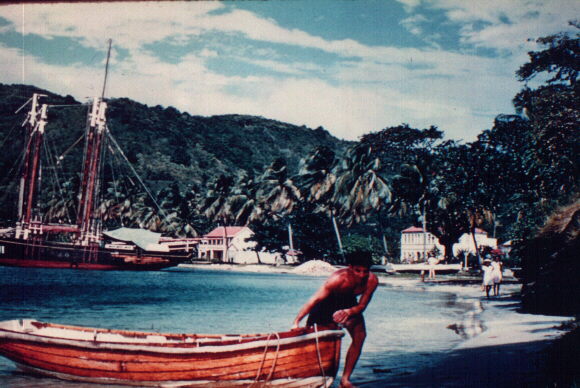 So on March 9th at 4:30 pm we first came to alongside the inner wharf at the old 1745 Naval Dockyard, (Nelson's Dockyard, English Harbour) little knowing we would be spending the rest of our lives there! The first thing we did was a big refit on the grassy deserted wharfs. Then we picked up shingles wind strewn over the dockyard to fix the roof of the old Commissioner's Room & Paymaster's House in which we squatted to make a shoreside home.