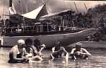 One day, when refitting after the ocean voyage alongside the deserted wharfs, where there were only goats grazing amongst the ruins, a rich American from the newly established Mill Reef Club said "Gee, what a lovely schooner, you wouldn't take us for a sail down islands, would you?" Well, that's how it all started. From then on, charters snowballed. First Dad and one son went along and left the other to look after Mum in the Pay Office, then the day came when the sons went sailing alone. All the time we kept in touch on 2527 kz with a surplus American tank transceiver, with dials all marked in Russian, as they had been made to support "Aid for Russia" during the war.