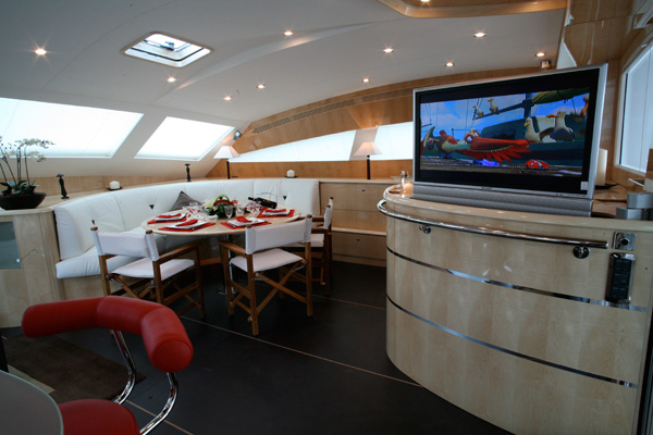 Amenities/Water Toys | Special features | 16ft Caribe 90 HP, Towing Ring, Wakeboard, 2x1-man Kayak(s), Waterskis (adult), SATCOM, Deck Shower, Swim Platform, Jacuzzi (master cabin), Cinema, Local TV, DVD Library, CD Library, Stereo, DVD, CD |