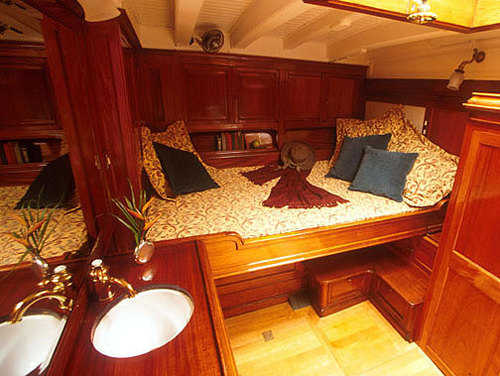 Best for two couples or a family, Sincerity offers a full width master cabin with an extra long double, a single berth and vanity with sink. The port cabin has one single berth. The starboard cabin has two singles, one of which is extra wide and extra long. Guest cabins share one large bathroom with a shower. Quarters for the crew of four, crew’s mess and separate crew’s head are in the forepeak. Available down island through February and in Cuba from mid-March to May 1st REGULAR WINTER RATES APPLY