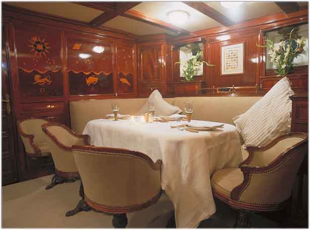 SINCERITY has two guest cabins and one large guest head and shower. The full width aft master has a double and a single berth and a washbasin/vanity. The starboard guest cabin has a double berth plus a single athwartships. There are two singles suitable for children in the dog house for family charters. Luxurious new upholstery and soft furnishings throughout. Crew of four. REVISED SUMMER 2006 RATE $15,500 plus all expenses ($500 REDUCTION)
