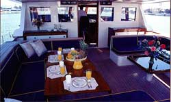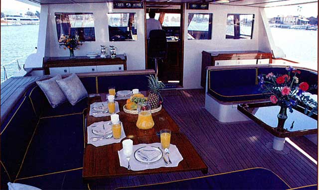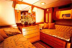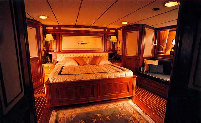A marriage of elegant comfort and serious sailing performance, Galileo accommodates six guests in an exquisite John Mumford designed teak interior featuring classical columns, graceful moldings and gold-plated fixtures. The owner's suite comprises a spacious stateroom with a centerline king bed, a large study/office with worldwide communications, and a master bath with tub and separate stall shower. There are two en suite guest cabins, one with twin lower singles and one with a queen berth. Captain David Hanna and his partner, Chef Petra van Wouden, former chef of Mollies Hotel in Auckland, New Zealand have worked together on private and charter yachts for five years. (Mollies is a small boutique hotel chosen 2005 Best New Small Hotel in the World by Harper’s Hideaway.) A first mate and two stewardesses complete Galileo's crew of five professionals dedicated to giving the highest level of service.