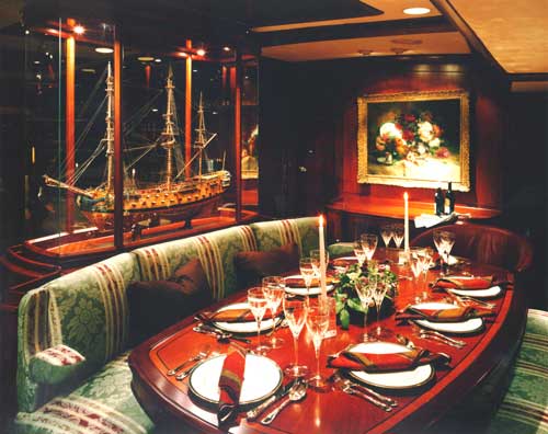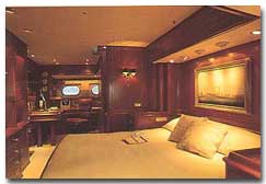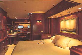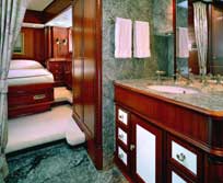 Edwardian gentleman's club. Stretching full-width at the stern, the master suite has a king-bedded stateroom and a spacious en suite head with tub and separate stall shower - all in marble. The adjoining study can be partitioned off to make a good size fourth guest cabin with a settee that converts to a double bed, plus a pipe berth. This cabin has its own full head and shower. Two guest staterooms with private en suite marble baths have twin lower singles that convert to queen beds. One of these cabins has a Pullman upper berth suitable for a child. WINTER 2007: