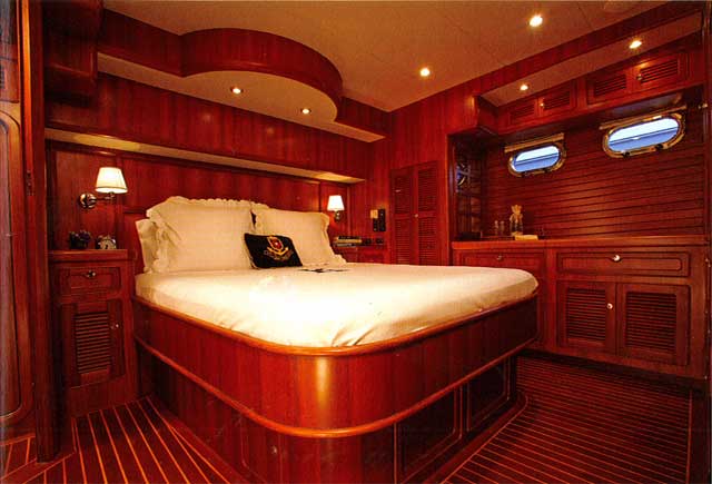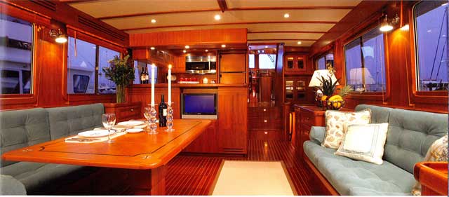 Louis. Her interior is a showcase of fine materials: Hand finished teak paneling, sea blue ultrasuede, and polished granite counters and bathroom floors. |