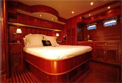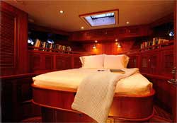 Accommodations for four in two cabins. A separate staircase gives the en suite queen master private access from the main salon. The queen guest cabin shares the second head/shower with the crew. |