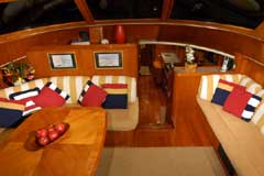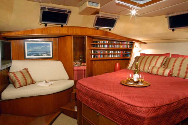 Two master cabins offer luxury accommodations. The queen full-width master offers cedar-lined lockers, color TV/CD/DVD, Bose sound system, custom upholstery and carpeting. The ensuite master bath is fitted with white Italian marble and contemporary designer fixtures. Completely remodeled and enlarged, the forward suite is very well laid out with a generous double bed plus single upper, flat panel TV and DVD, and wrap-around teak desk. The new oversized bath features a tiled stall shower. Crew quarters and head are separate. Available for Antigua Sailing Week! Summer 2007 in New England Winter Rates: