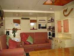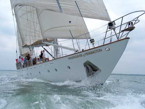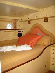 Light colors are dominant in her spacious air conditioned interior where exquisite faux finishes create the look of marble. On deck a large semi-circular guest cockpit, seating eight comfortably, wraps around a table which rises from the cockpit floor for al fresco dining then disappears at the touch of a button. The en suite master cabin features a king size bed. Forward of the saloon are port and starboard en suite guest cabins. The port cabin’s lower berth is a fixed double; the starboard cabin’s lower is a single that pulls out to a double. Both cabins have upper Pullman berths. All berths are 6’6” (2 meters) long. Windweaver is available for charter beginning in Calvi, Corsica, June 9 until July 14 when she goes back to England for Cowes Week. In the Med she will pick up guests from Palermo, Naples or Rome airports and either of Corsica’s airports. Captain Alastair Vickery, onboard since her launching in 1999, has 17 years charter experience. First Mate Simon Moss is full-time crew. Summer 2007 Rates: US $18,000/2 $20,000/4 $22,000/6 – plus all expenses. ____________________ |