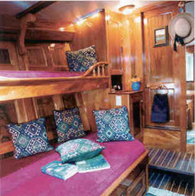 Open for the month of July in Maine! It would be hard to find a more authentic Maine experience than sailing with Captains Earl and Bonnie Mackenzie on the schooner they designed and built in Maine - Bonnie Lynn. Three cabins with double and single berths provide flexible accommodations for 6, with two guest baths. Separate en suite crew quarters are aft. Earl is a born and bred Mainer whose earliest memory is being on his father‘s lobster boat in Friendship, Maine. He has skippered yachts and work boats since his teens, served 20 years in the Coast Guard Reserves and was co-owner of a boatyard. Bonnie grew up in Michigan, joined the Peace Corps right out of college, traveled a lot and started sailing more than 20 years ago. She is a very accomplished cook – especially seafood, lobster & chowder - and caring hostess. They owned and operated the schooner Flying Fish, chartering in Maine for 13 summers, gathering ideas and planning the details that became Bonne Lynn. Both Earl and Bonnie have a keen interest in marine biology & maritime history, evidenced by the ship’s extensive library. The warm, relaxed atmosphere they create onboard brings guests back time and again. SUMMER 2007 RATES: $9,500/2 $11,000/4 $12,000/6 – incl x bar & dockage. Pays travel agent commission. |