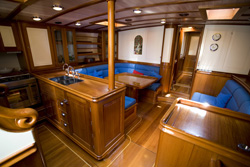 traditional teak and holly flooring. A traditionally beamed deckhead