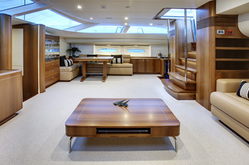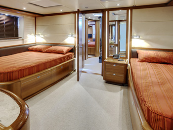 Guest Cabins: 3 Guests: 6-7 Total Crew: 4 Superb accommodation and entertainment for up to seven guests is provided with exclusivity, style and comfort. Master Stateroom has a queen & a single bed, ensuite head & shower with marble vanity, lots of stowage space, pop-up 26” LCD television. LIARA's state of the art electronics inventory includes touch screen remote controls for television, lighting, blinds, stereo, satellite television, I-pod docking station with onscreen controls and VOD (video on demand) server. Guest Stateroom has a queen bed, ensuite with head marble vanity and separate shower. 22” LCD television and touch screen remote control for TV, lighting, blinds, stereo, I-pod docker with onscreen controls and VOD server and shared access to satellite television. Guest Stateroom with 2 single beds, ensuite head with marble vanity & separate shower. 22” LCD television, and touch screen remote control for TV, lighting, blinds & stereo, I-pod docking station with onscreen controls and VOD (video on demand) server, shared access to satellite television.