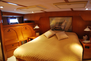 guests in 3 cabins. Two en suite forward guest cabins have one lower double berth and private heads with separate showers. COCONUT is fully air conditioned through out. Crew has a separate companionway, heads and shower.