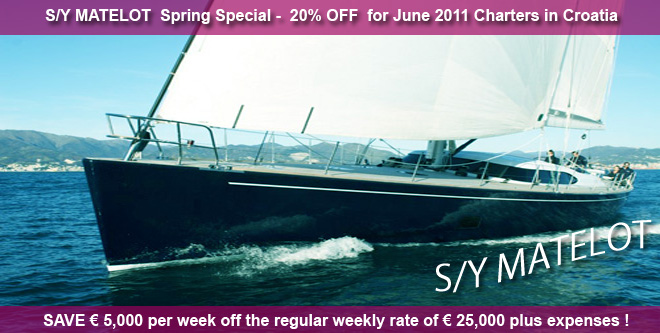 Attention brokers: We invite you to copy & send a "broker friendly" version of this eNews to your own clients. Broker friendly link: S/Y MATELOT Spring Special - 20% OFF for June 2011 Charters in Croatia |
