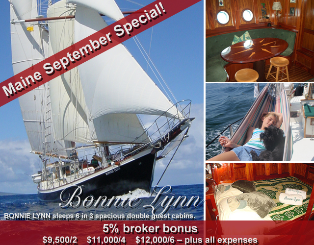 Attention brokers: We invite you to copy & send a "broker friendly" version of this eNews to your own clients. Broker friendly link: Schooner BONNIE LYNN MAINE SEPTEMBER SPECIAL |