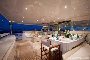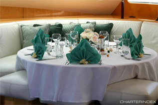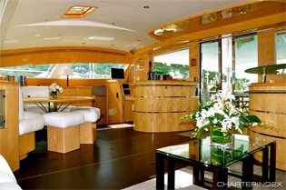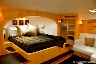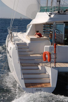 luxury of a full-size Jacuzzi tub. There are so many choices on deck the trampolines, aft deck, bridge deck, the "teak beach", and broad steps aft (very easy for water access!) that everyone will find their own favorite spot. |